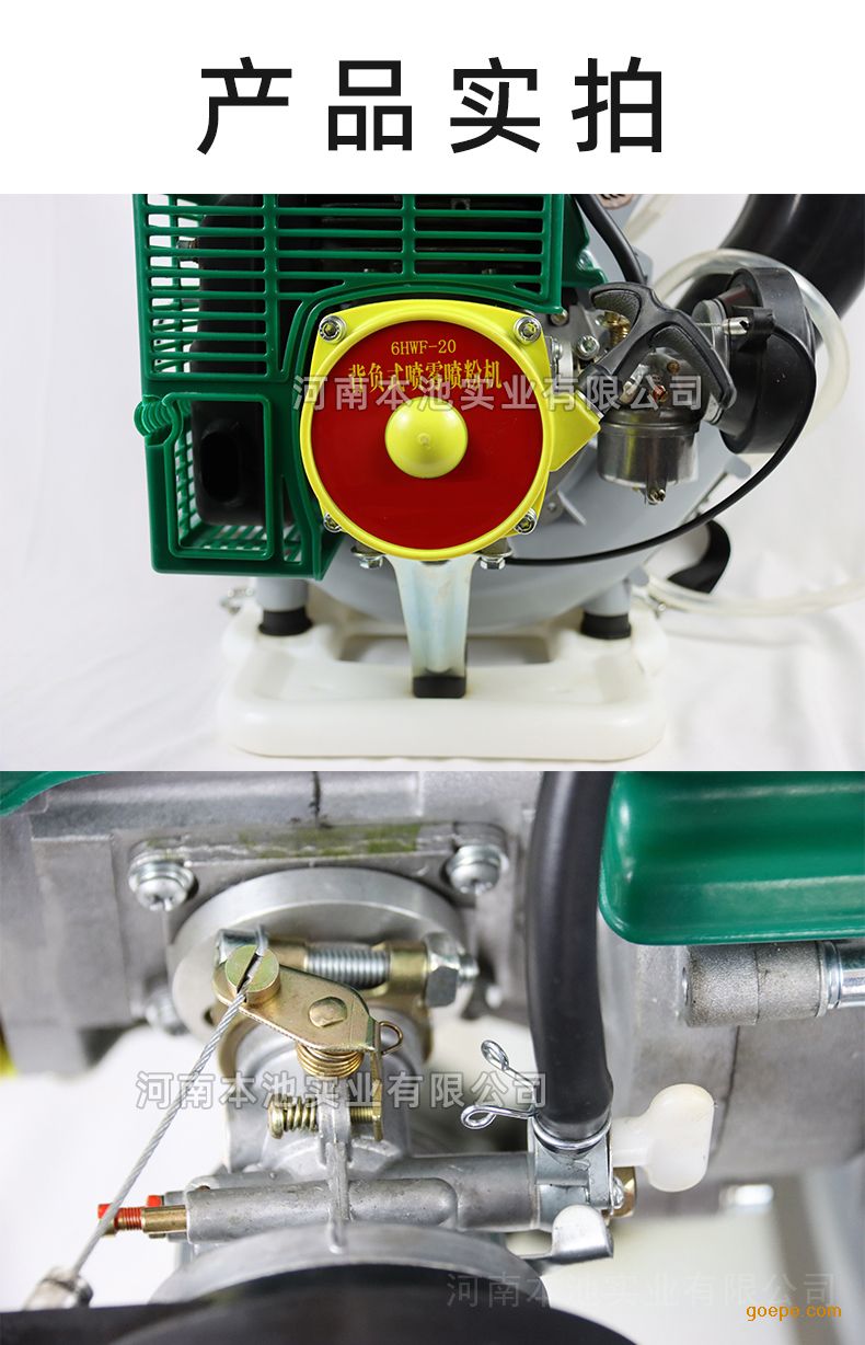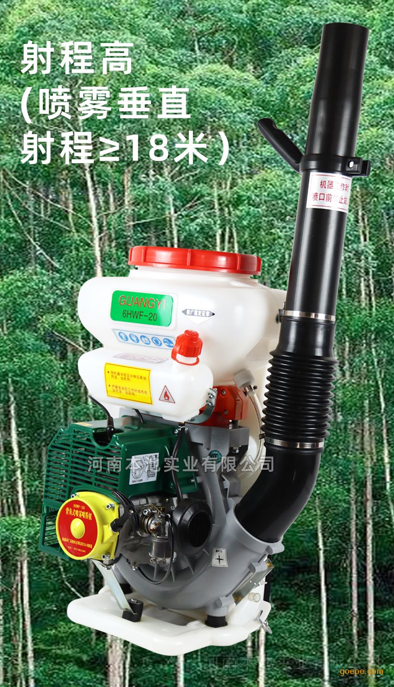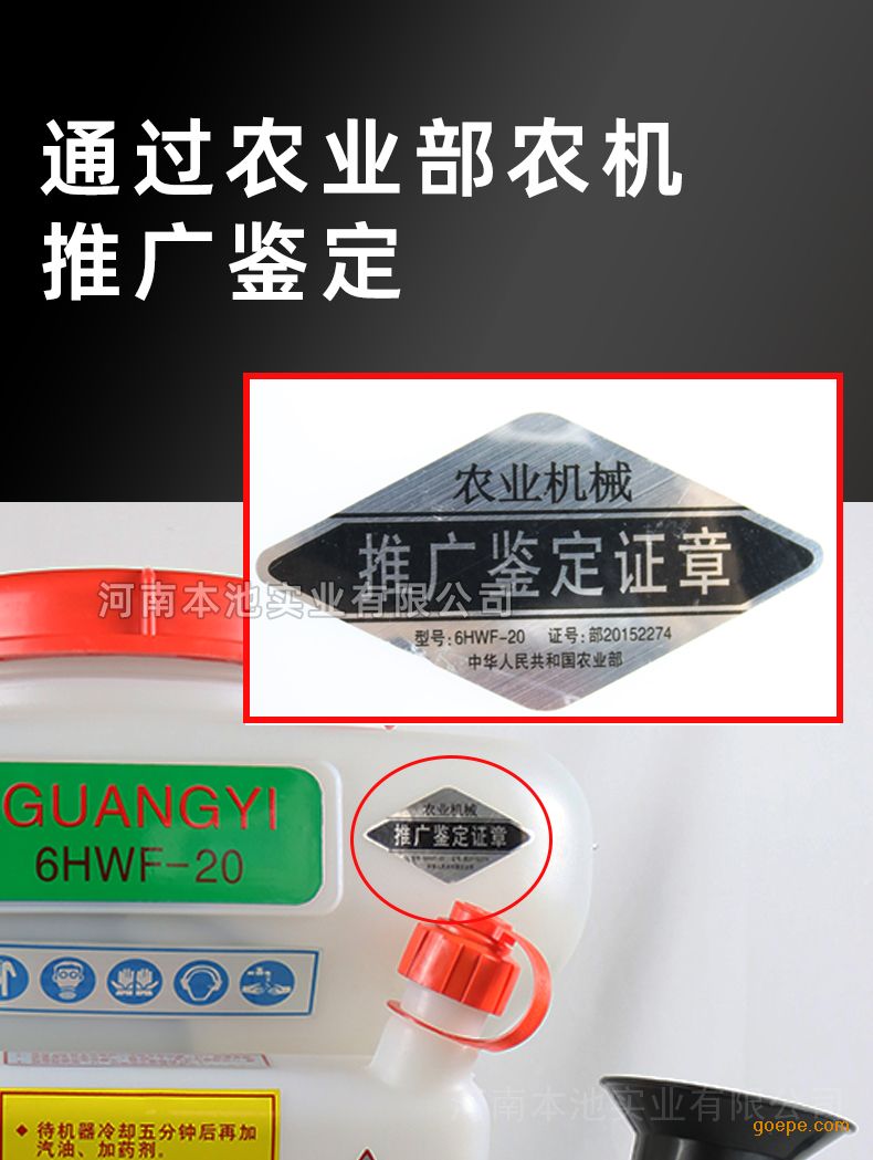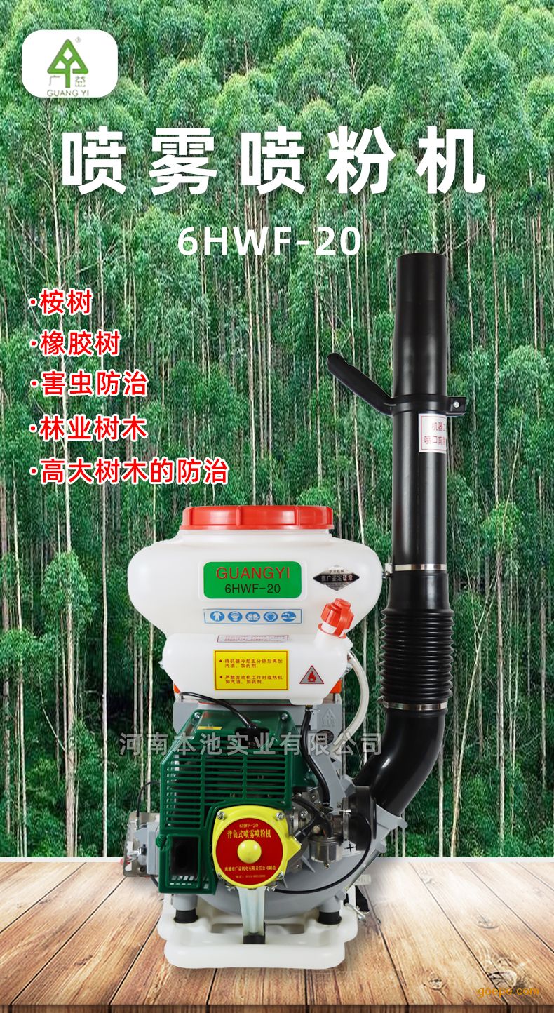 广益6HWF-20喷雾喷粉机,背负式,加厚防脱背带,背负舒适,施肥喷雾一机双模式,大功率4KW,二冲程发动机,散热块,性能稳定,省时省力,使用寿命长,射程高,喷雾垂直射程≥18米,产品通过国家3C认证和农业农机推广鉴定,一机多用,多环境适用,适用于大面积农林作物的病虫防治,林业树木杀虫喷药,喷粉,打药,施肥,播种,投饵,卫生消杀,菜场、垃圾场等大面积消杀等。