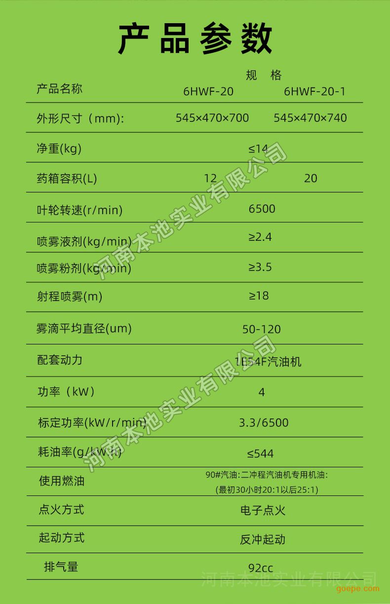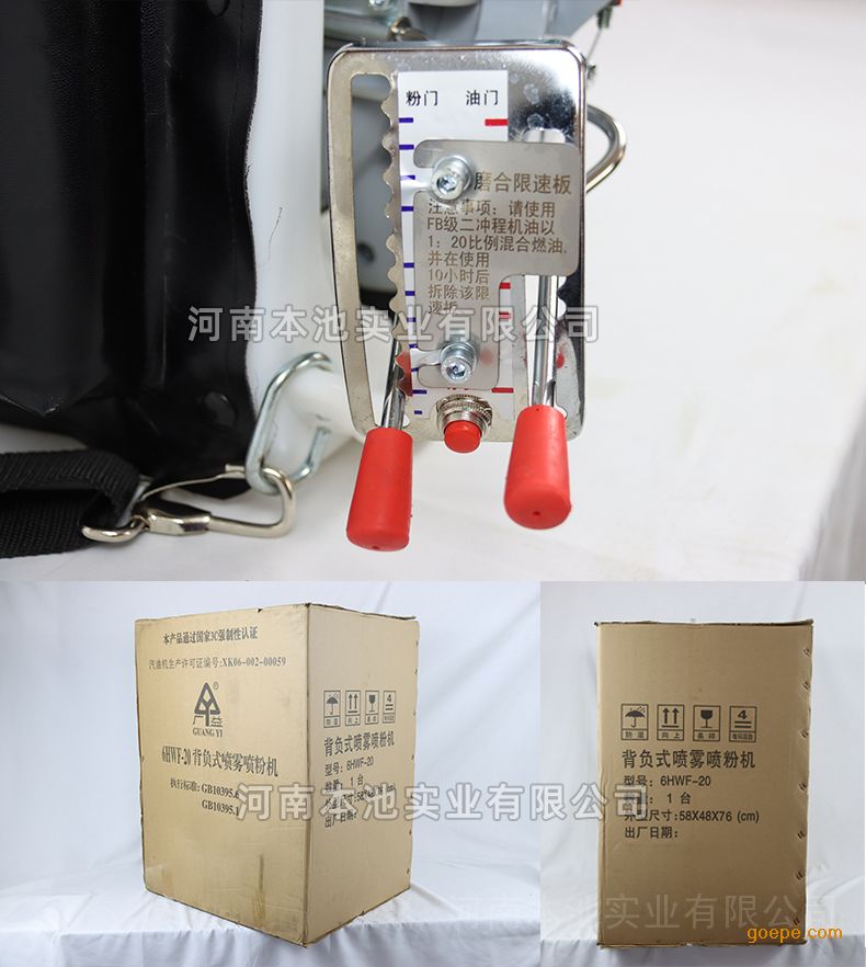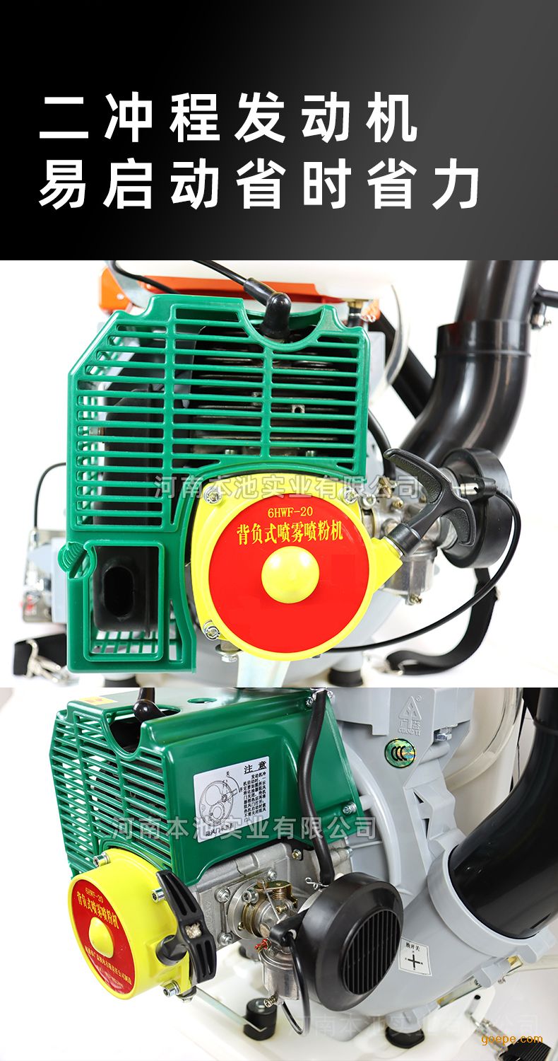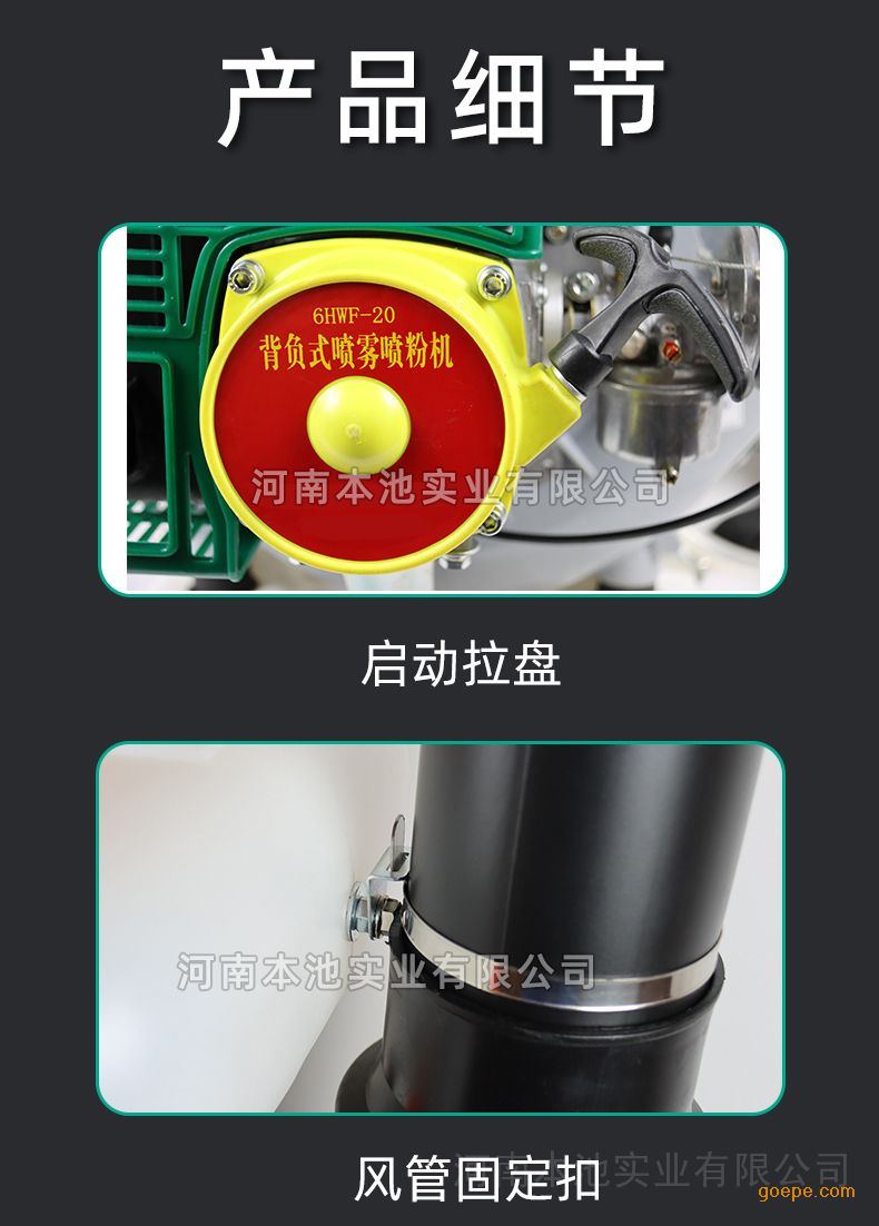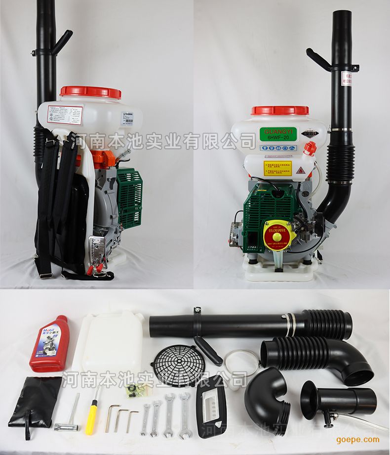 广益6HWF-20喷雾喷粉机,背负式,加厚防脱背带,背负舒适,施肥喷雾一机双模式,大功率4KW,二冲程发动机,散热块,性能稳定,省时省力,使用寿命长,射程高,喷雾垂直射程≥18米,产品通过国家3C认证和农业农机推广鉴定,一机多用,多环境适用,适用于大面积农林作物的病虫防治,林业树木杀虫喷药,喷粉,打药,施肥,播种,投饵,卫生消杀,菜场、垃圾场等大面积消杀等。
