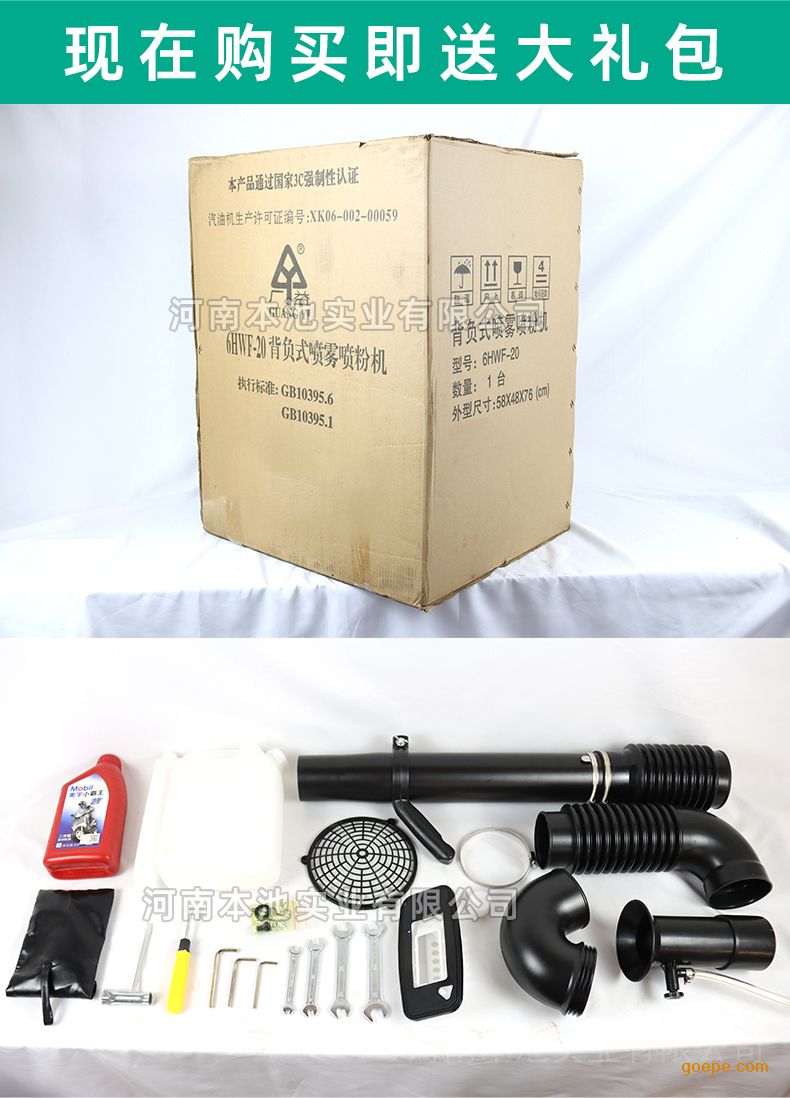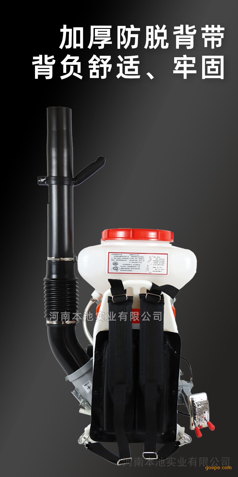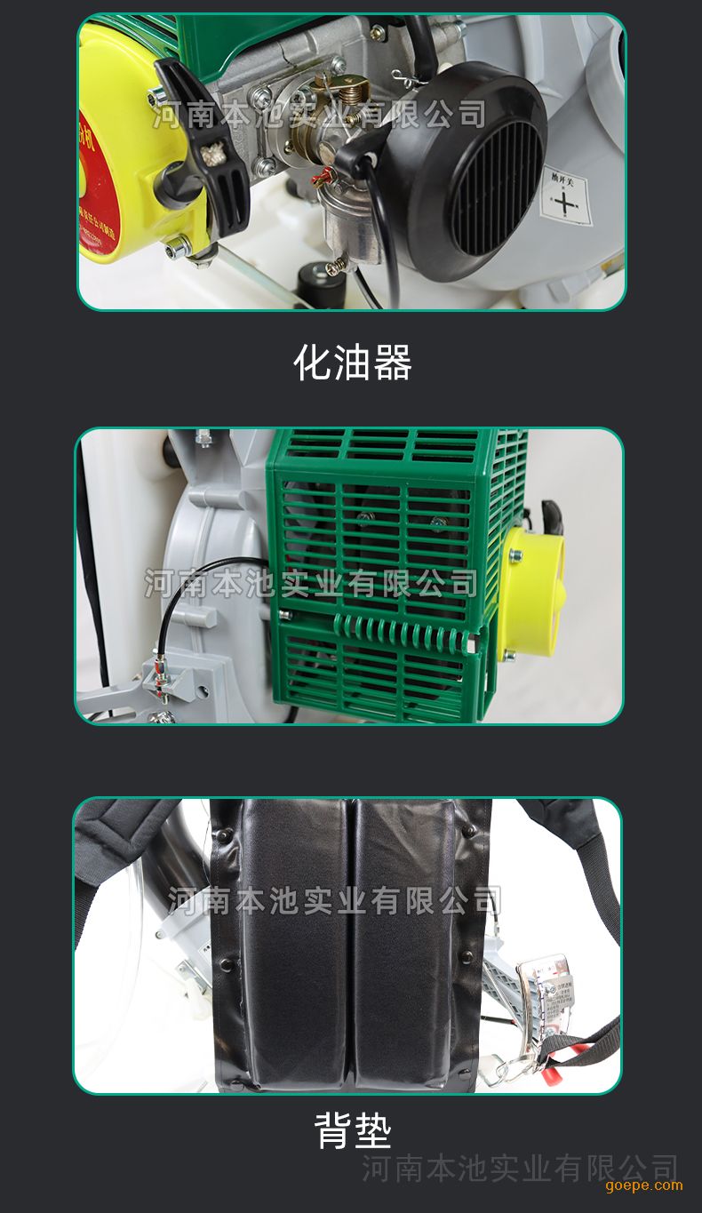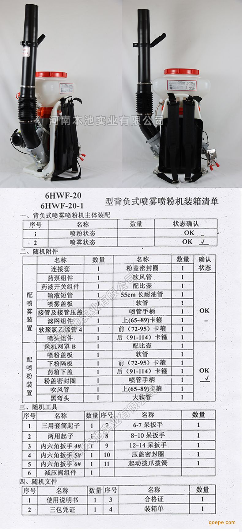 广益6HWF-20喷雾喷粉机,背负式,加厚防脱背带,背负舒适,施肥喷雾一机双模式,大功率4KW,二冲程发动机,散热块,性能稳定,省时省力,使用寿命长,射程高,喷雾垂直射程≥18米,产品通过国家3C认证和农业农机推广鉴定,一机多用,多环境适用,适用于大面积农林作物的病虫防治,林业树木杀虫喷药,喷粉,打药,施肥,播种,投饵,卫生消杀,菜场、垃圾场等大面积消杀等。