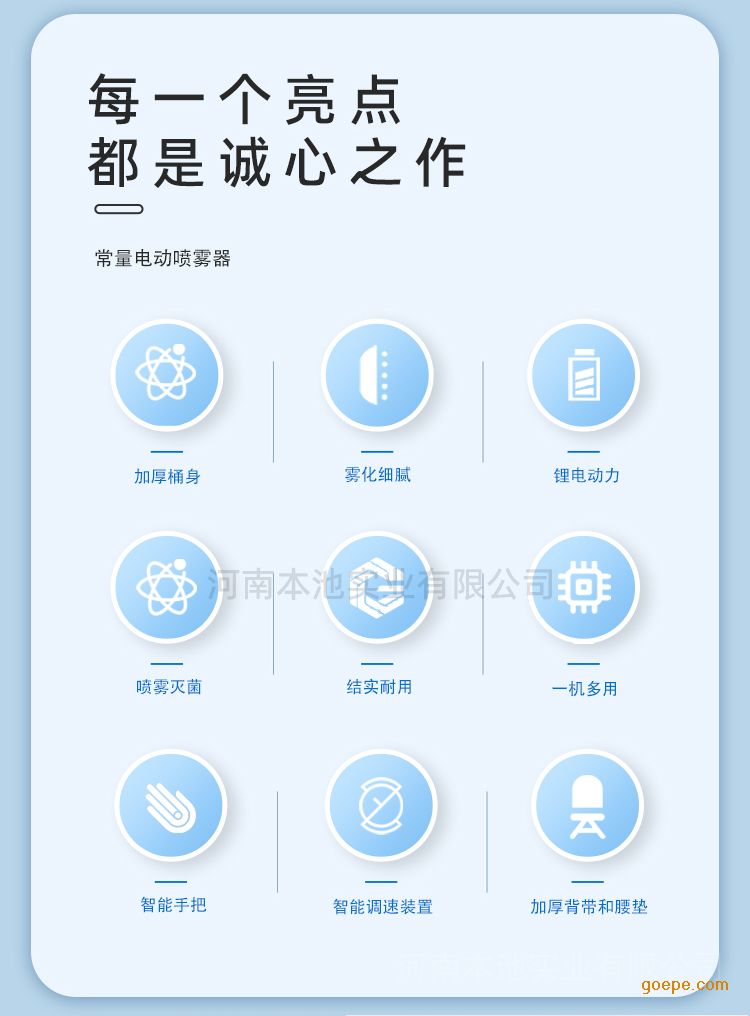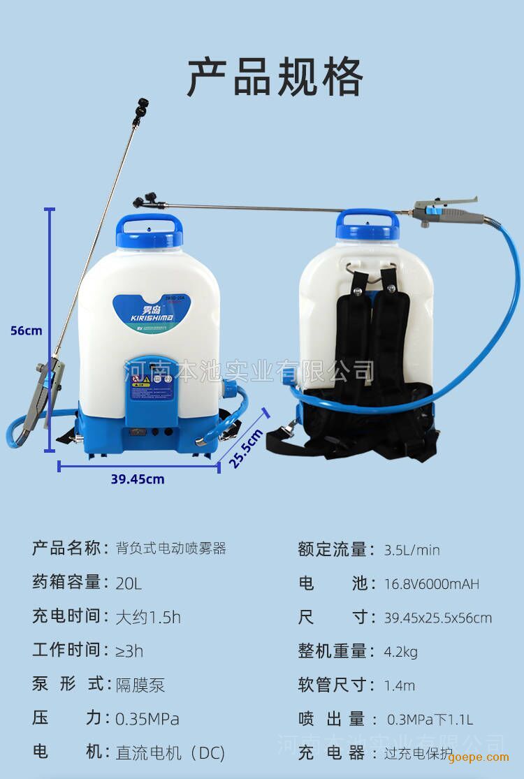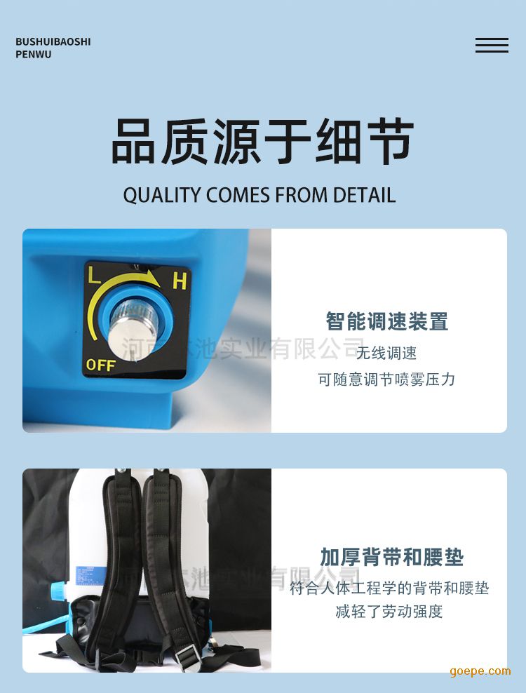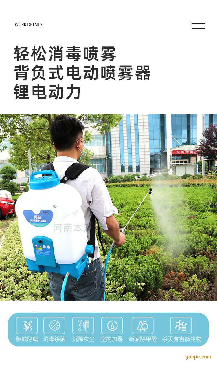 雾岛3WBD-20A背负式电动喷雾器锂电消杀喷雾机,锂电动力采用高压电机,一机多用途,雾化细腻,智能调速装置,智能把手,广角扇形喷头,采用自回流隔膜泵,压力高,噪音低,不易堵塞,支持快速充电,三小时可以充满电,一款可以解决多种环境消杀的喷雾器,适用于各种环境,比如办公环境,学校酒店餐馆食堂,购物商场等多方面的消杀和清洁。