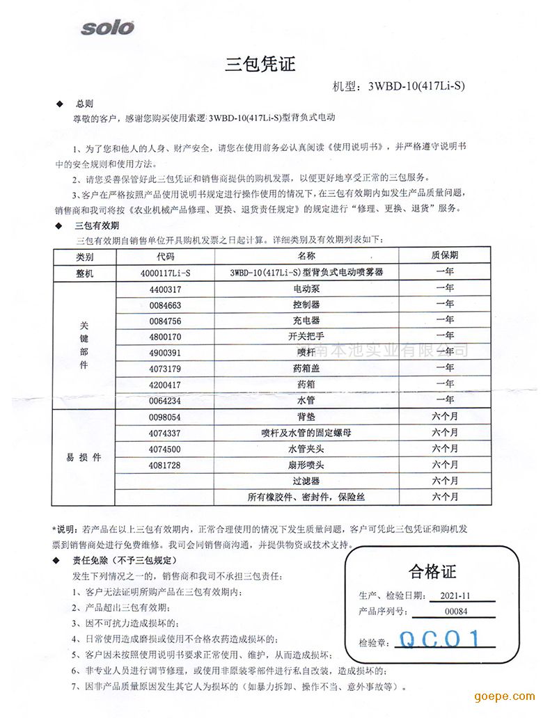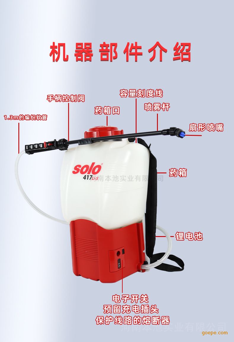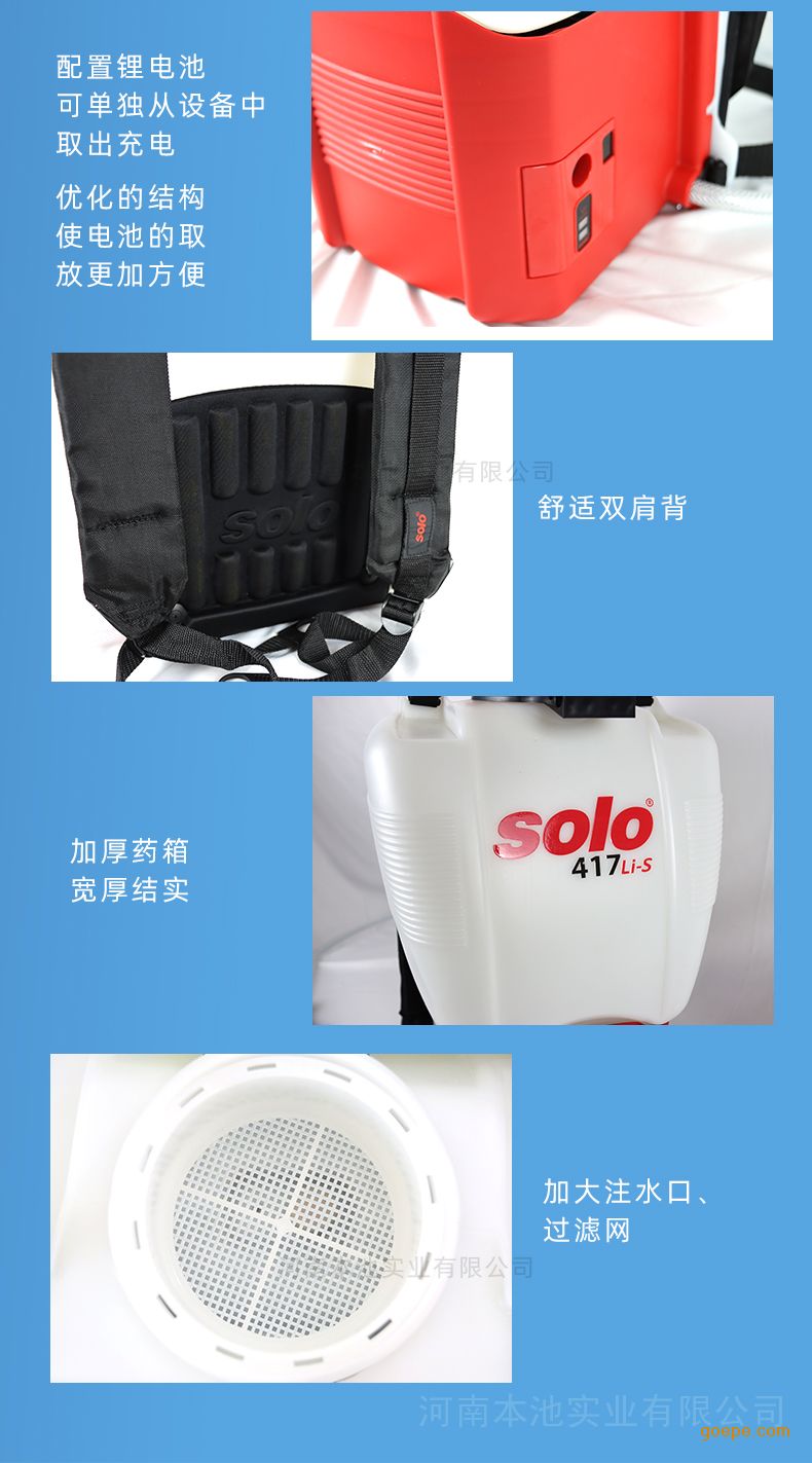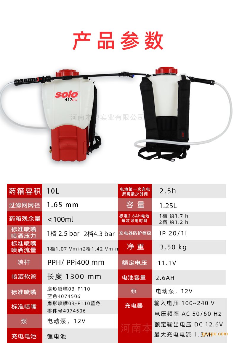 索逻SOLO417Li-s背负式电动常量喷雾器产品技术参数: