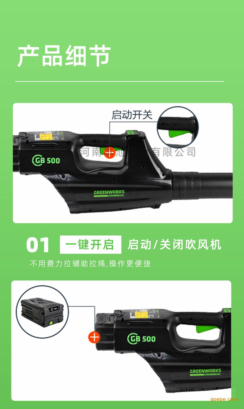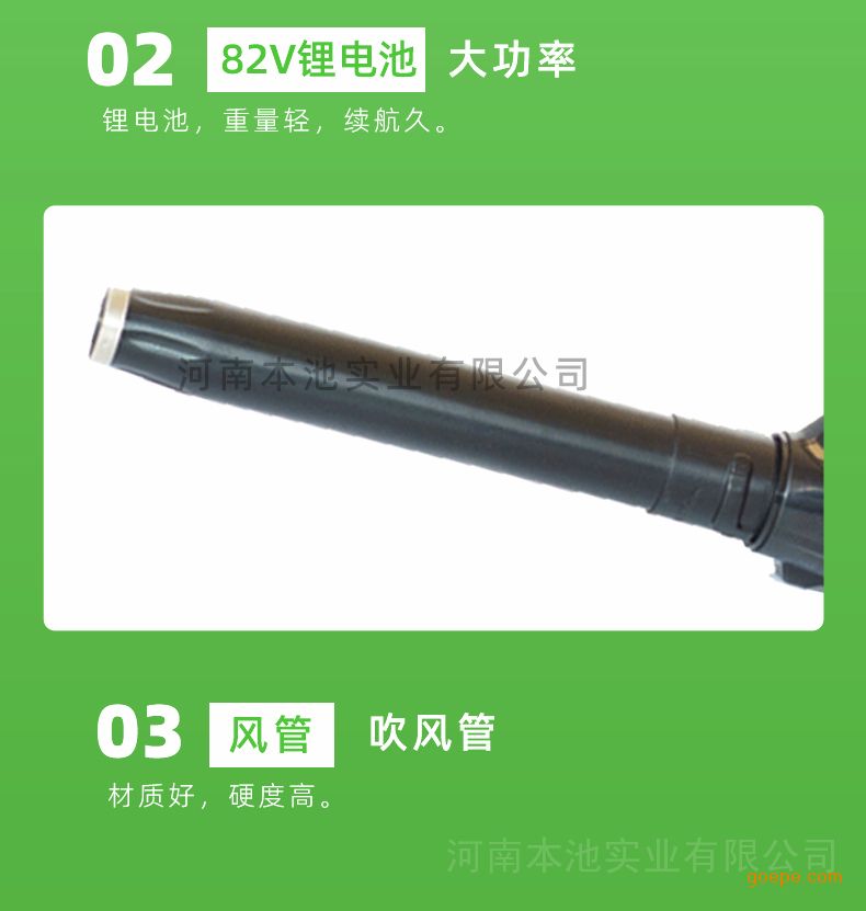 格力博82V手提式吹风机,风速高,噪音低,轻松便捷,锂电池设计,风量大,手持式,包胶把手使用舒适,省时省力,充电式,无线束缚,轻巧便捷,采用一键开启或关闭吹风机,不用费力拉辅助拉绳,适用更便捷,82V锂电池,大功率,重量轻续航久,无刷电机,风量可调节,易于启动,适用场景广泛,可以道路清理碎石渣,大棚吹雪,小区物业吹落叶,工地吹灰尘等,灵活轻便,单手即可使用