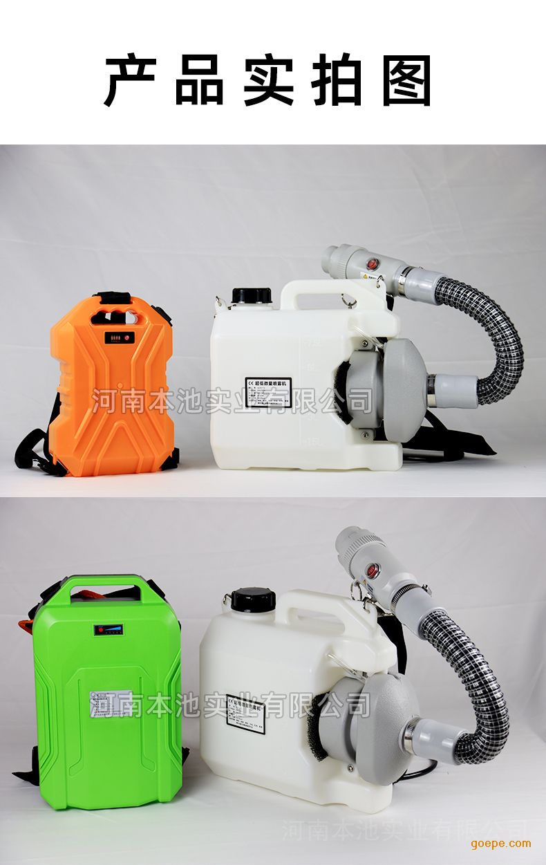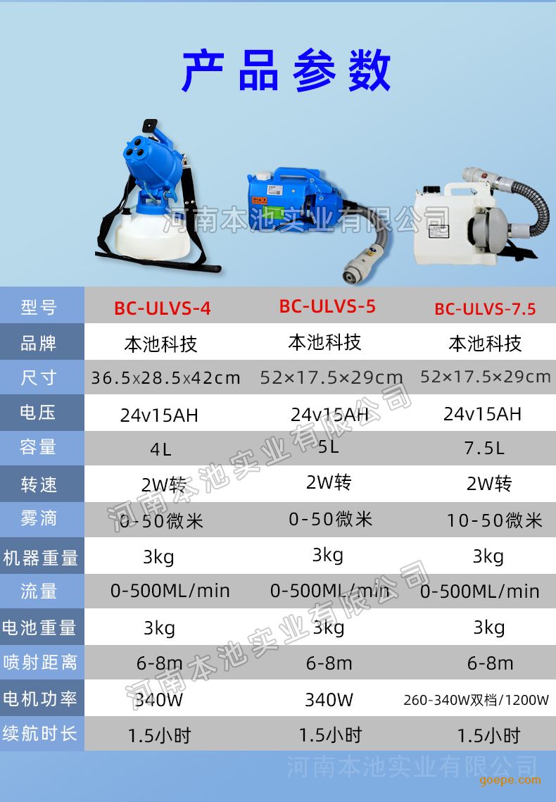 本池科技BC-ULVS-4/5/7.5超低容量喷雾器锂电气溶胶喷雾机,一机多用消毒机,斜挎加背包手提设计,雾化细腻,适用范围广,大功率,弥漫强,纯铜电机,无线大容量锂电池,三款电池通用,充电便捷,续航久,可调节阀门,强力送风,增压涡扇,强力喷洒,加长风道,喷洒有力均匀,扬程更远,适用多种场景:适用于:车站消毒、学校消杀、养殖场消杀、厂房消毒等。